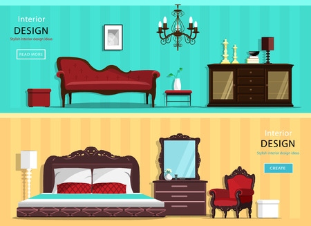Set Of Vintage Interior Design House Rooms With Furniture Icons Living Room And Bedroom Flat Style Vector Illustration Royalty Free Vector Graphics Living Room Bedroom Vintage Interior Design