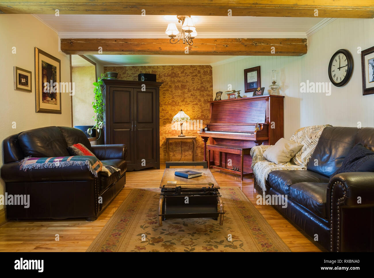 Music Room With Dark Brown Leather Sofas Upright Piano Wooden Living Room With Upright Piano Design