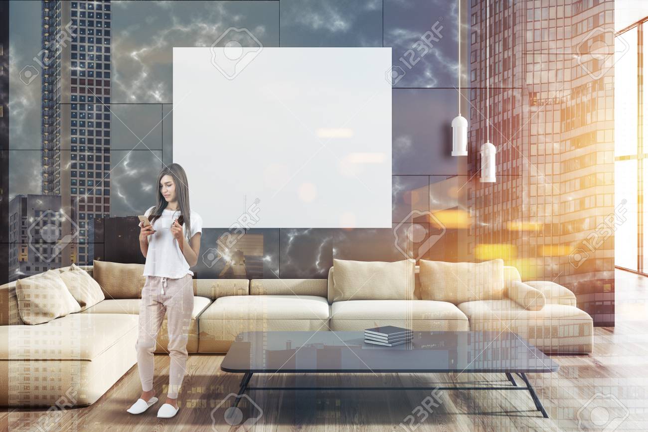Woman In Modern Living Room Interior With Black Marble Walls Stock Photo Picture And Royalty Free Image Image 106221342 Modern Black And Beige Living Room